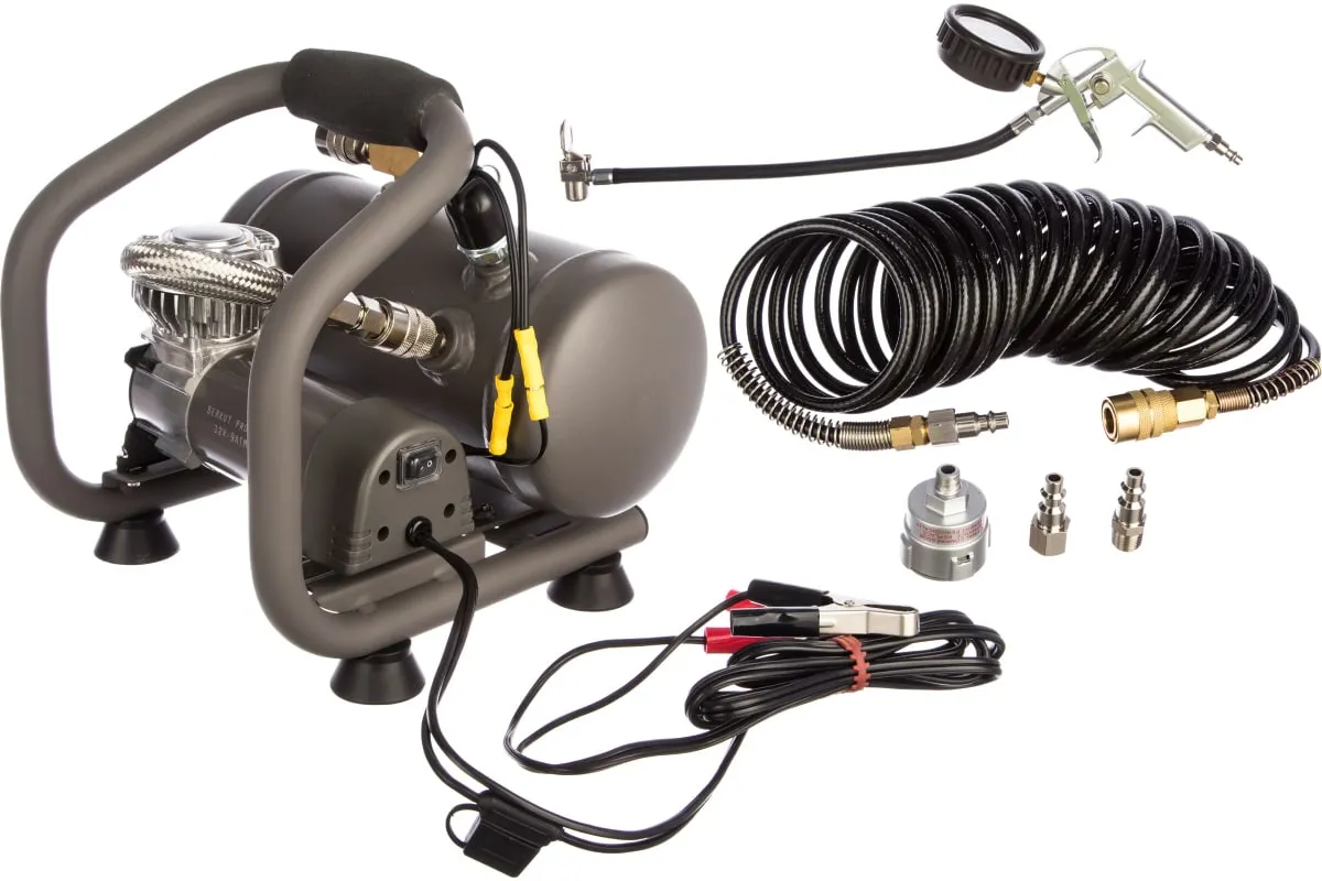Компрессор;, Витой шланг-удлинитель DF-030;, Пистолет для накачки шин с манометром IG-041;, Воздушный фильтр усиленный AF-0683;, Фитинги для пневмоаксессуаров 1/4" (2 шт.);, Руководство по эксплуатации;, Гарантийный талон;, Упаковочная коробка. |