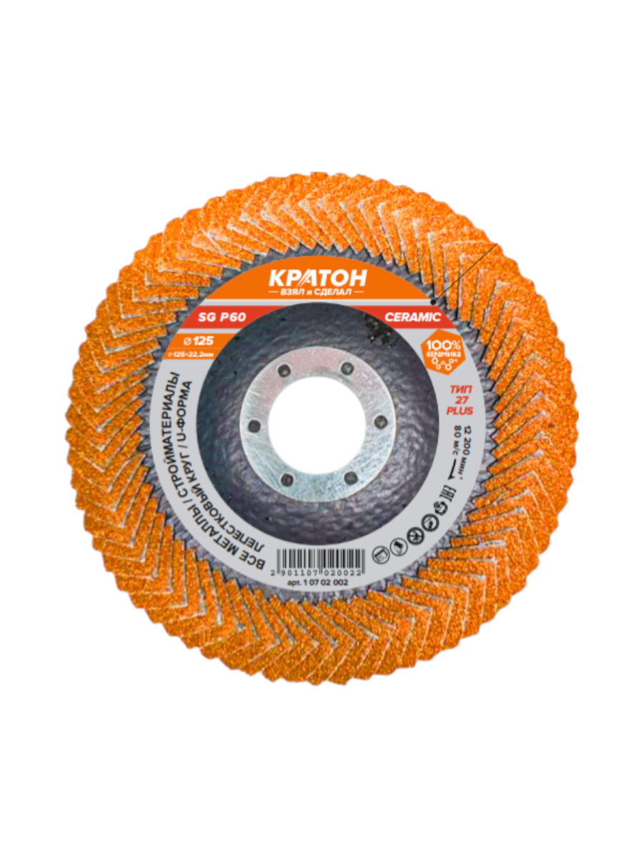 Круг лепестковый шлифовальный Кратон Ø125 мм СG Р60 Т27 Plus станет надежным помощником в выполнении задач по шлифовке и зачистке, обеспечивая качественный результат.