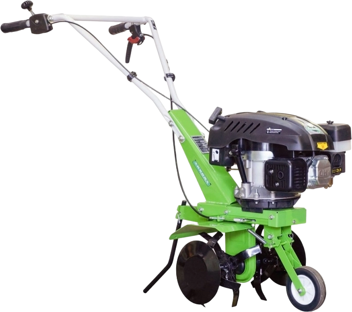 - Мощность двигателя составляет 5 лошадиных сил, что позволяет обрабатывать плотные грунты.