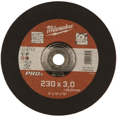 Отрезной диск по камню PRO+ (230х3х22.2 мм, вогнутый) Milwaukee 4932451500 подходит для резки бетона, камня, а также плитки из природного камня.