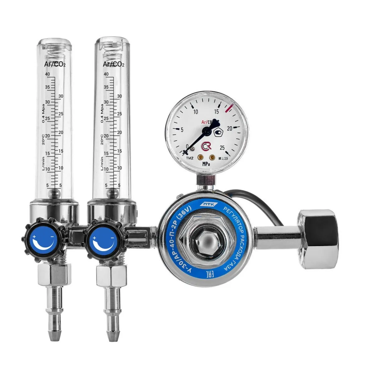 Универсальный Регулятор ПТК(CO2/Ar), макс. давление на входе 15 МПа, наибольший расход газа 30/40 л/мин, латунь, с 2-мя ротаметрами, 36В.