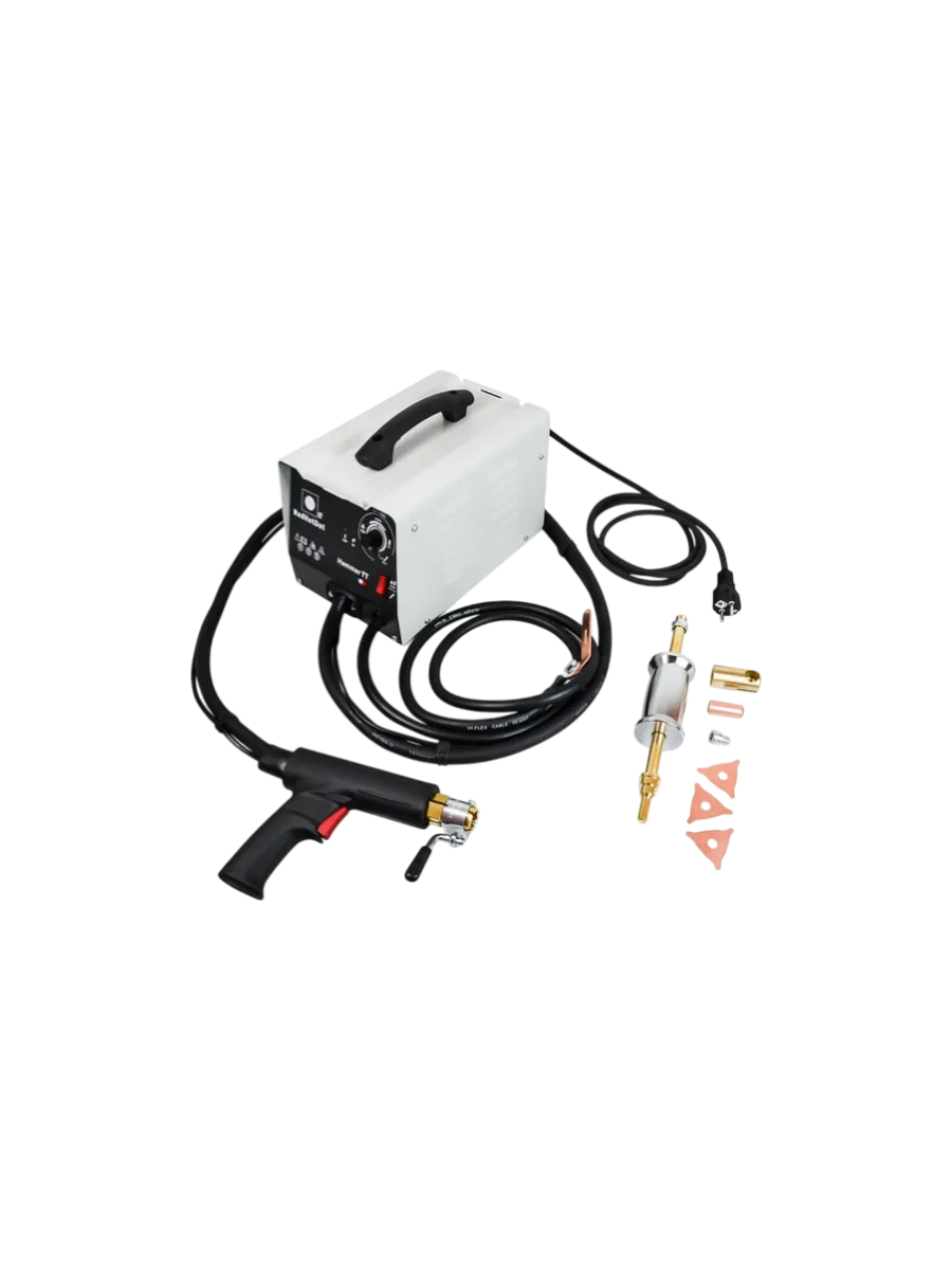 - Комплектация включает споттер, пистолет с кабелем, кабель массы, обратный молоток весом 1.1 кг, треугольные электроды с насадкой и упаковку.