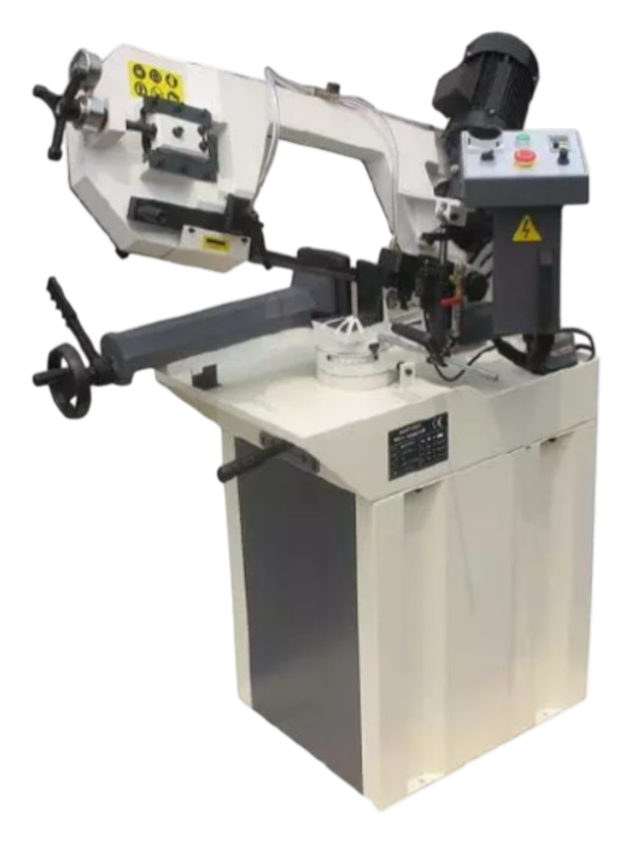 Подвижная направляющая с роликовыми подшипниками для натяжения полотна, Перепускной клапан для плавной регулировки опускания пильной рамы, Тиски с ручным зажимом и рычагом быстрого доводчика для быстрой замены заготовки, Скорость вращения пилы с плавной регулировкой скорости (5-90 м/мин), Трехлучевой маховик для механического натяжения ленты, Датчик контроля натяжения полотна – тензометр, Защита: датчик на обрыв полотна (остановка станка), датчики при открытии кожуха рамы (остановка станка), Мерный упор 300 мм для точности распила, Помпа для подачи СОЖ и регулировочные краны для настройки напора СОЖ, Пила ленточная квалитет М42 для долгосрочной эксплуатации |